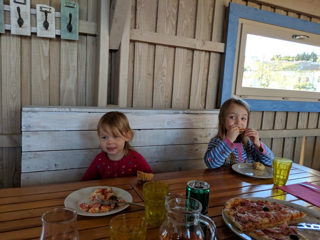 Homps is a Le Boat place, and while most of the restaurants near the water were closed, Le Foudre a couple of minutes further away served up a pleasant lunch and afterwards we declared it was time for a nap for half the crew while 5YO watched Aladdin and I tried to make headway with John Julius Norwich’s A History of France. Post-nap, a bit of cruising and a handful of locks (much more capably handled, this time) and we arrived at Argens-Minervois. This has a bay off the canal itself where a Locaboat Holidays base is located. 20 euros for the night (this seems to be the going rate). While apparently there is “rien” in the main centre, the girls were happy to see a play area to mess around in, and also a pizzeria “La Terrasse du Port” which opened at 6.30pm, meaning dinner off the boat was possible. Huzzah! Pizzas were good and plentiful amd their music playlist was right up my street – The Avalanches, the Beatles, Gil Scott Heron and a funky cover of that “Remember Me” track from the 90s.