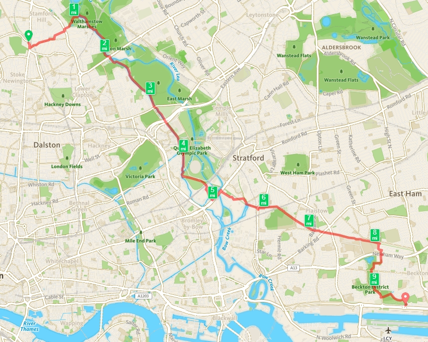However, while an impressive thoroughfare in terms of distance and directness, God it is boring. Better on a bike, I reckon. Anyway, I was glad to bid goodbye to it and jiggle and jink down through Beckton District Park to the station. After no running for about 3 weeks, two 10 mile runs on consecutive days will mean my legs are pretty achy tomorrow. Two days off before leg 3!