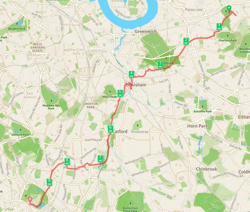 Once out the other side at Woolwich, I did my best to follow the proper route, first along the river, then bushwhacking through parks. I’d got to Maryon Park ok when the Capital Ring sign pointed me up a LONG flight of steps. In the words of one of the national guard guys in Rambo: First Blood, “screw that Clinton, I ain’t going up there”. I also took stock of how quickly I was covering ground and realised I was way off the pace for getting to Crystal Palace by 12.30 if I followed anything like the official route. I had a moment of realisation: