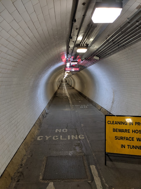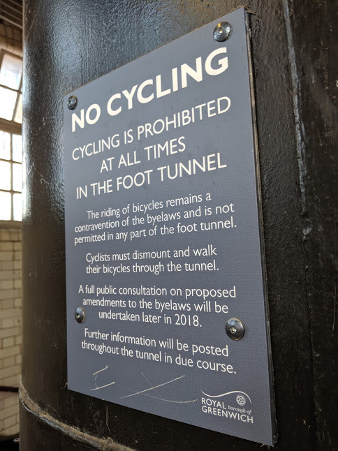 This contains the lift that takes you down to the foot tunnel. Perhaps to make up for my earlier civil disobedience, I followed the “no cycling” rule to the letter, although I suspect I’m the only one who does given the other cyclists I saw – and it is a very tempting cycle track.
