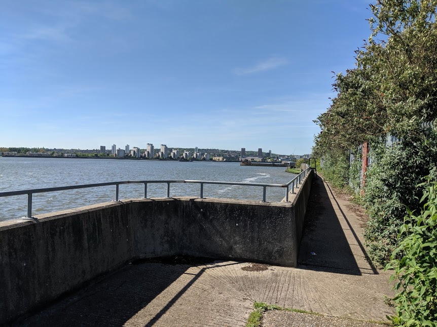 So finally off on the bike – I had the usual navigational issues almost straight away – I fully intended to follow the larger road route to the Woolwich Ferry, but ended up going straight on somewhere into featureless flats that was more or less a big building site, but that was, in fact, the official Capital Ring route taking you on the Thames Path. (I also had to pause frustratingly for at least 5 minutes while Natwest rang me up with an automated fraud prevention call – at least that unlocked my card again). The Thames Path was really a tiny goat track, feeling like it was there on sufferance and everyone would far rather be rid of it. In places you were squeezed between building entrances and chain link fences where it didn’t seem possible you were going the right way – but you were.