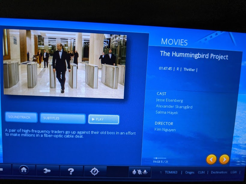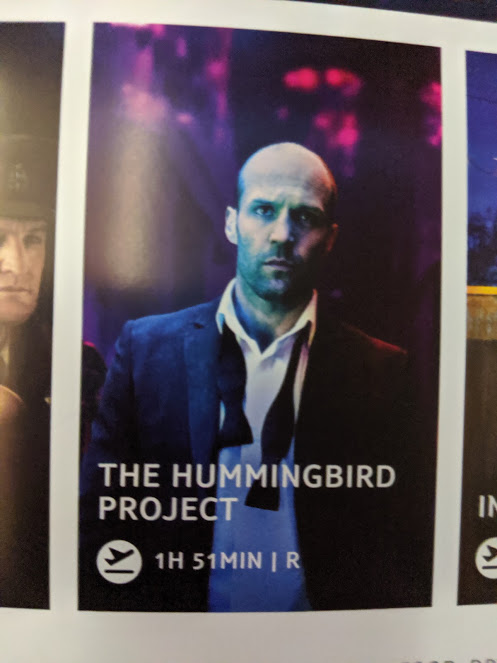 So it should come as no surprise that on my recent flight home from Cancun, I selected “The Hummingbird Project”, as that clearly showed it was a “new release” heavily featuring Statham in its imagery. Such was the prevalence of Statham in the printed magazine, online summary and detail page, I wasn’t too concerned that the “Cast” section didn’t include his name – it was obvious this must mean “supporting cast to The Great Statham”.