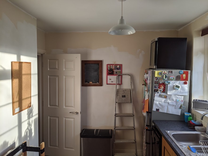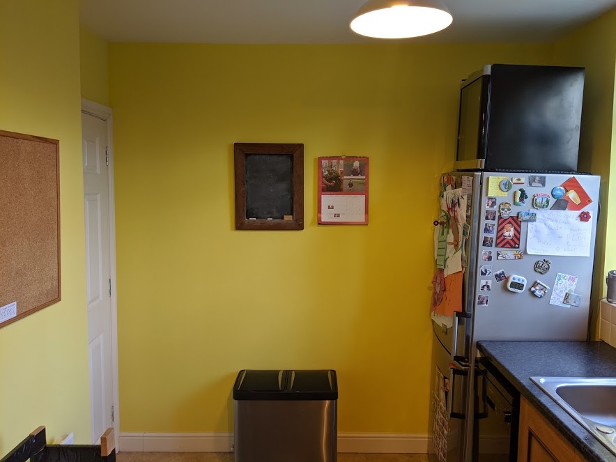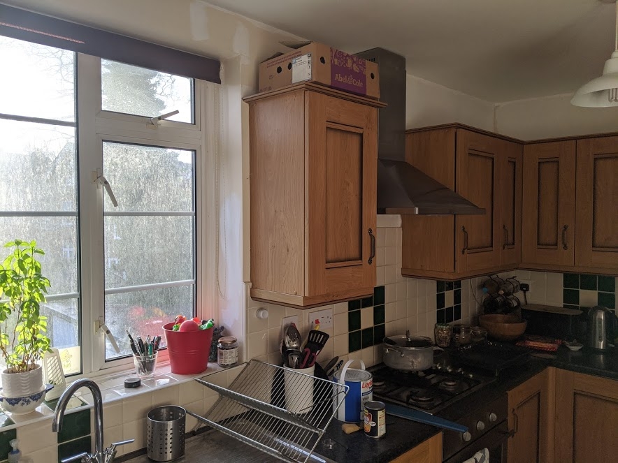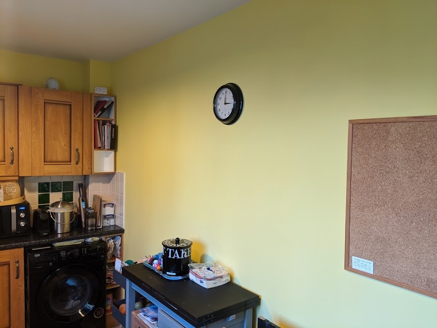It’s been on the list for a while, but I finally had a bit of spare time to redo the kitchen walls. I’d already done the ceiling, and rashly decided to daub the worst marks/discolourations on the walls with the same white paint.
