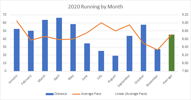 For next year, my goal will be 1000km, or 621.4 miles, which averages 12 miles a week. If I can avoid injury, definitely feasible!