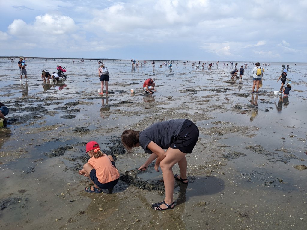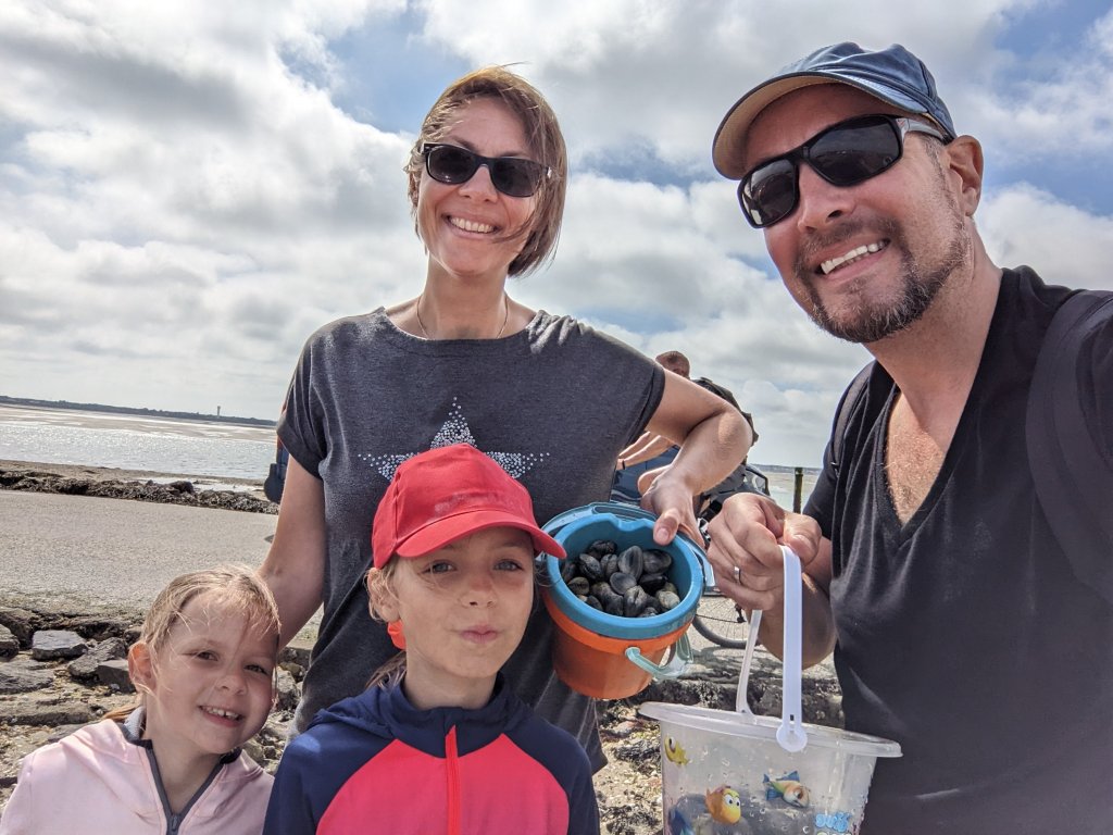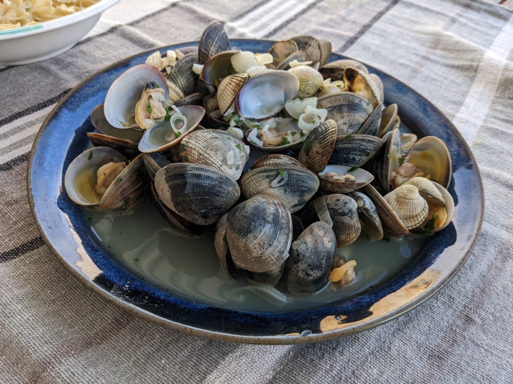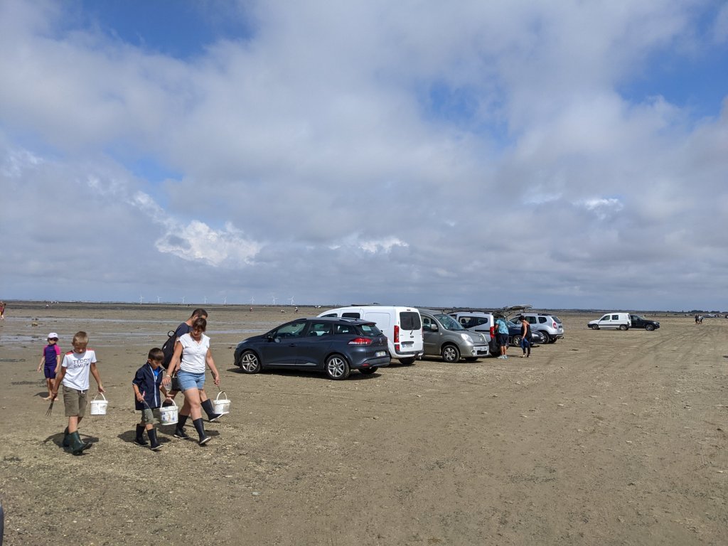 You can’t be on Noirmoutier without being aware of the tides. One of the routes in is a road that is completely submerged at high tide, after all. For inland folk like me, it remains amazing to see how far the sea “moves” from high to low tide. And one thing you can do at low tide is go out onto the revealed seabed and dig around in it to find things you can eat. We went to an organised event where they lend you a digging fork, but loads of people just do it themselves, of course. I was a bit dubious we’d find anything, but once we’d started, the Japanese Clams emerged from the muck with decent regularity. Once they’d cleaned themselves in clean brine for a couple of hours, my wife cooked them like mussels (shallots, parsley, onion, dash of white wine), a bit of pasta on the side, absolutely lovely. Nothing like living on forage to connect you to nature, after all!