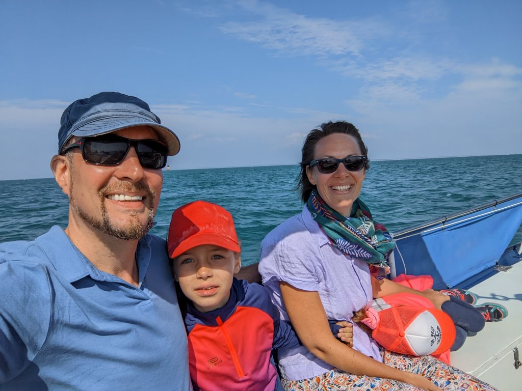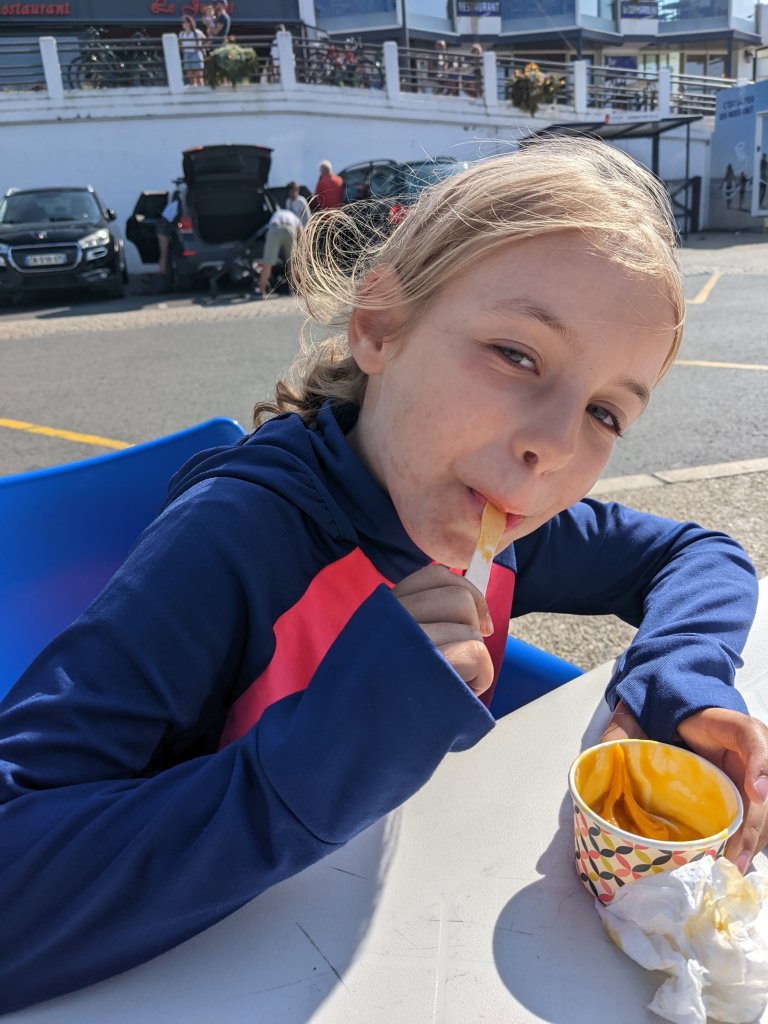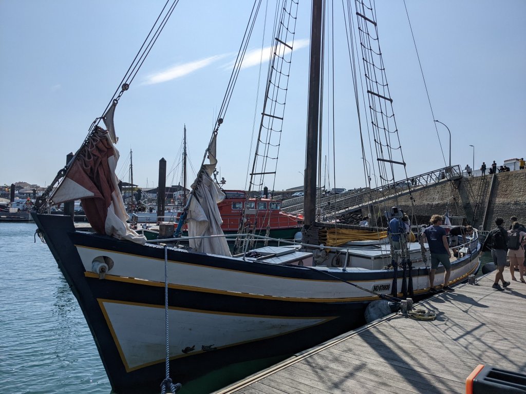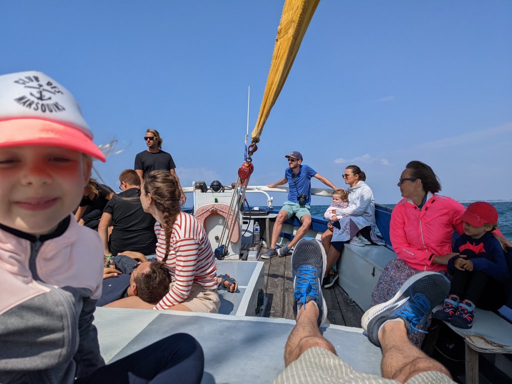 Whilst in the Office du Tourisme earlier in the week booking the pêche à pied, there was a mention of a “promenade en mer” which sounded fun, so we duly booked that as well. They’d run out of leaflets so we were short on details, but we got to the NW corner of the island at the right time (funny how on this pretty small island there are such different characters in the component villages – L’Herbaudière is a fairly big port for fun sailing and fishing, and packed with restaurants of different types, even a hotel or two). The boat is O’Abandonado, a ~100 year or so old vessel with an interesting story (catching fish in Portugal, then delivering salt up to the 60s, then scuttled in mud to preserve it while the owner worked out what to do with it…then bought by a Frenchman in the 80s who cleaned it up, refitted it and brought it to France. And now it does little pleasure outings in the bay off Noirmoutier! Well, I thought it was great, but there was some seasickness in our little party and quite a few peaky-looking people on the boat. But nothing that a few ice creams afterwards couldn’t fix!