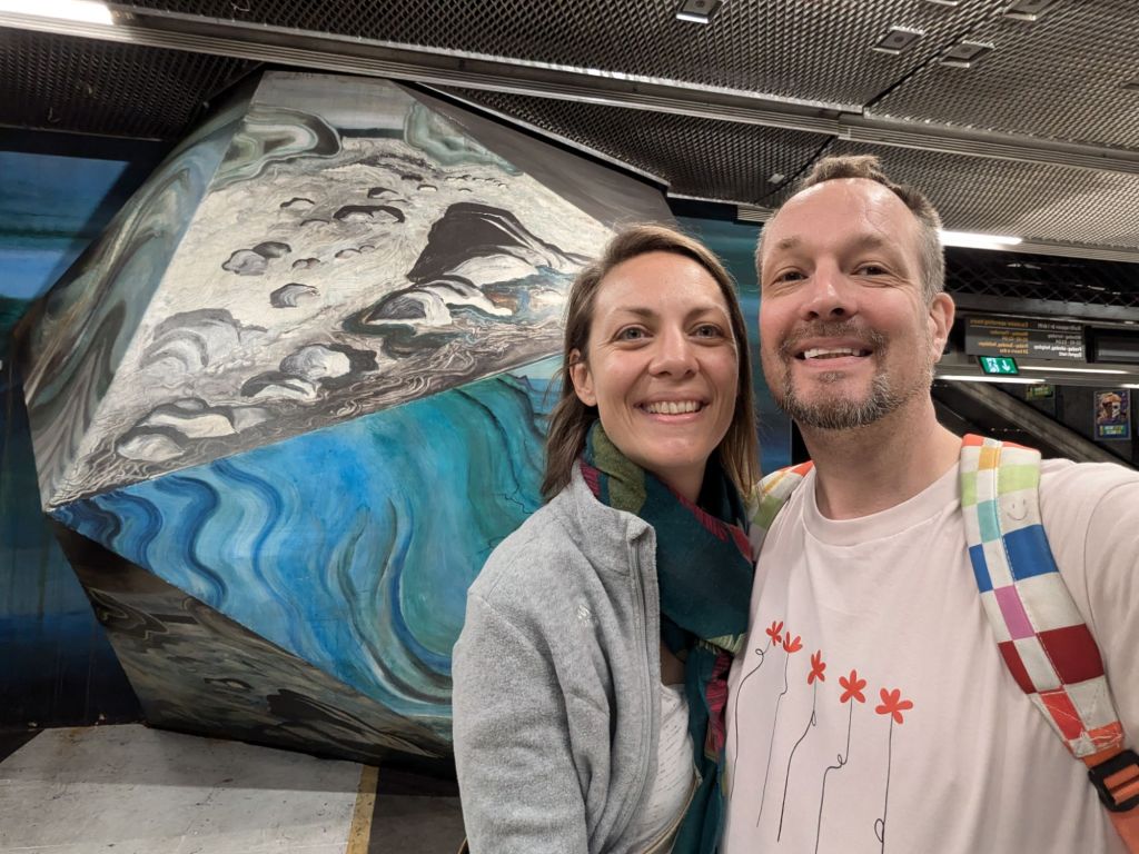 We had another full day in the city, and we’d read about the subway art as well as fika (basically, coffee and pastries). I cobbled together an itinerary starting at Odenplan – this wasn’t far from Generator and passed by a post office where I checked out sending a parcel of warm clothes we don’t need, and Astrid Lindgren’s house (which has a tiny plaque). We found the Café Pascal place and took a seat outside to eat croissants, Kanelbulle and Cappuccinos.