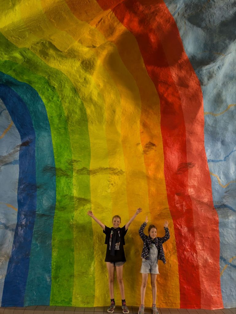We just took single tickets – 42kr a pop, kids ride free, so you just shuffle with them through the gates like one does on the tube. We surfaced at Odensmarmlung for some fresh air and to find a snack…the Fabrique place had sandwiches, but all too artisanal for the kids so we ended up with a 7-11. Absolutely perfect, except they don’t sell beer. 😟 Very different from Copenhagen where every place sells beer and more, and street drinking is very much the norm. No street drinking in Stockholm. But lots of ice cream! Although, the glace a l’italienne a la suédoise was a disappointment – the “strawberry” was just vanilla whipped ice cream with a flavoured sauce on top that set to a hard shell. Neither of the girls were impressed with taste nor ease of consumption.