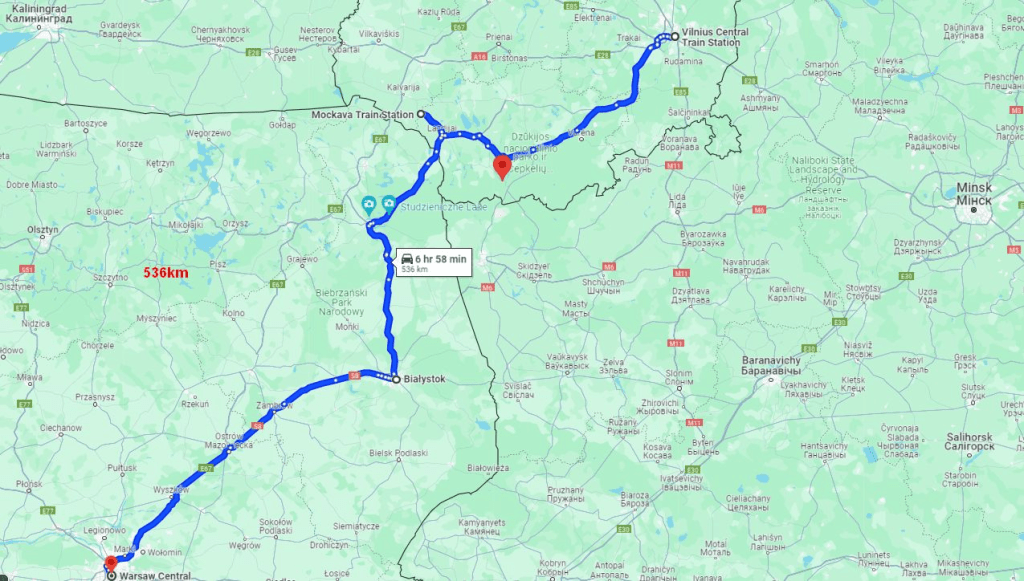 It was a little bit chaotic getting on the train. My seat reservation just said one seat, all the way to Warsaw. Plus, I’d checked that we were in 2nd class because there is NO 1st class on this service. Ok. But then it turns out the first train that has NO seat reservations, but does offer coffee & sandwiches – payment required. This goes to Mockava and takes 2h30, everyone gets off. A lady on our train says the tracks are different systems – there’s no question of there being a single train. So our seat reservations refer to the Mockava-Krakow train that stops in Warsaw too. I had thought about skipping Warsaw and going straight to Krakow, but it only arrives after 10pm, which feels a bit cruel to all of us. Oh, add to that the extra hour as Poland and Lithuania are in different timezones…so yes, it will indeed be a long day.