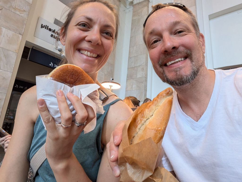 Vilnius has a nice station (as we knew from when we’d arrived, of course), coffee shops, an Iki Express little supermarket. AurĂ©lie bought some cornish pasty type things and doughnut-hot dogs to make sure we were ready for our 8 hour train trip with uncertain reprovisionung options.