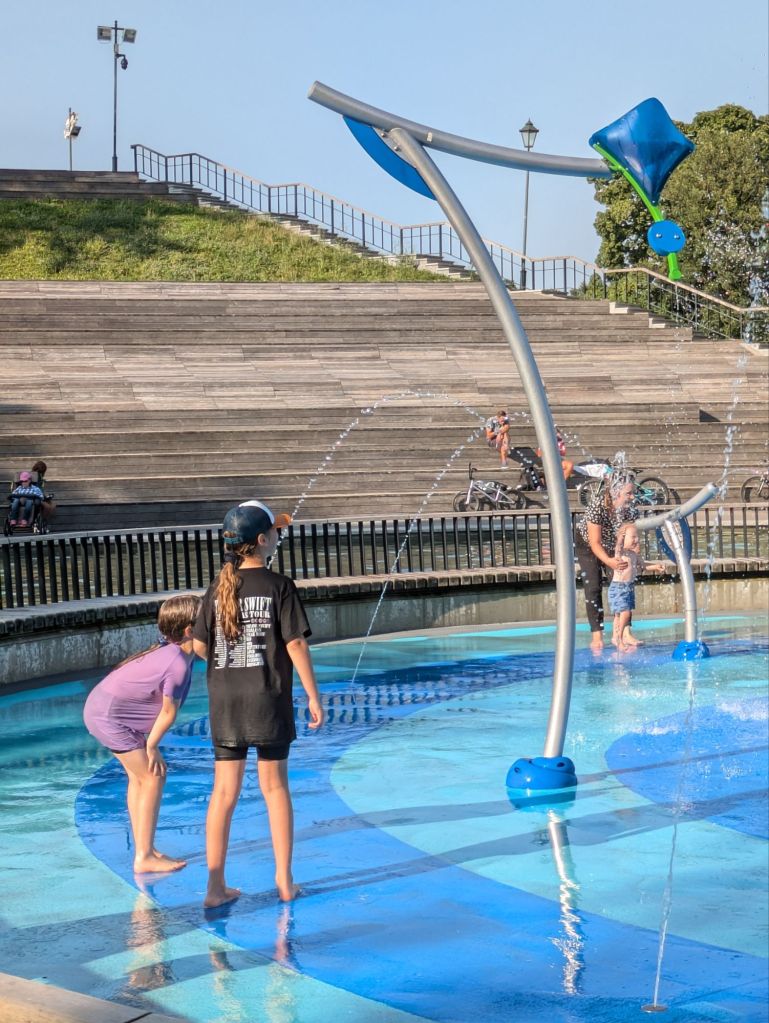 The playground was excellent, and although we didn’t have swimwear in the bag, we did have an extra layer, so the girls took full advantage of the wet play area. There was scope for swimming, but they had a GREAT time running through the fountains and sprays with the other kids.