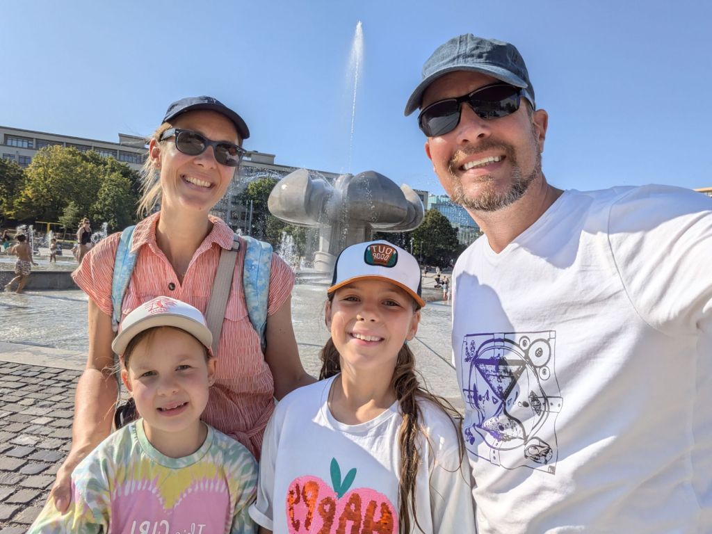 We’d had a pit stop by the river before the bus tour. After the bus, I whizzed off on a scooter to find flip-flops (Szechenyi baths in Budapest require them and charge 10 euros a pop – and it’s not about the cost, but the thought of being in a long line waiting to buy them. Chances are there’ll be no queue and the flip-flops will be so nice, we’d love to own some, but there we are). The Eurovea mall is sizeable, and Decathlon once again came up trumps. I whizzed off again to Freedom Square where the kids were playing in the fountain. Aurélie and I refreshed ourselves at the café alongside. Really, the trip optimized for kids would be pretty cheap – playgrounds, water play and the odd museum provided it’s good. The fountain in Bratislava is awesome for kids on a hot day (which it was).