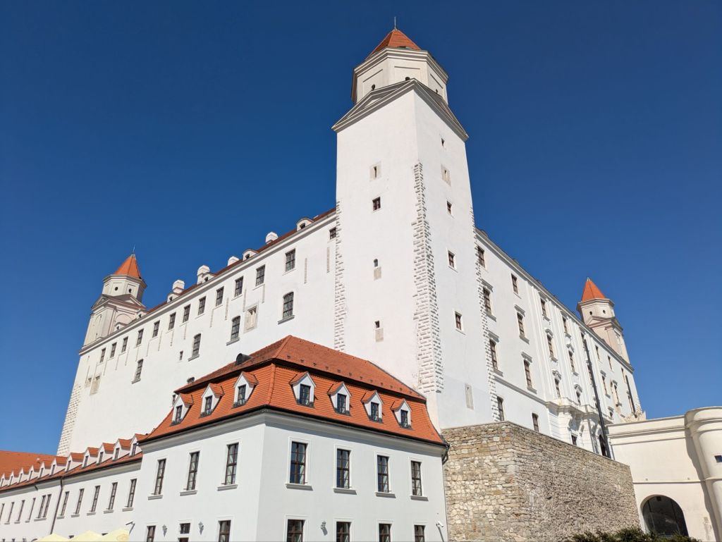 The hotel (yes, a hotel! One star, but a step up from hostels…) involved a check-in in one building but our room in the other was very nice and comfortable. Initially we just left bags at reception and set off to walk gradually to the lunch venue. It was another case of seeming like we’d have loads of time… but in the end, we didn’t. The in-laws don’t walk as quick, not helped by it being rather hot and Parlement (the restaurant) being high up, near Bratislava castle. We made it without casualty or mutiny and the lunch was very nice, washed down with a bottle of Bollinger (it being Aurélie’s birthday) and a local Pinot Noir, which was excellent.