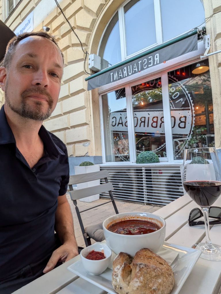 I slipped out on my ownsome to the nearby restaurant that looked really appealing and I wished we’d gone to last night…I invited the others, but left them watching the Olympics while I enjoyed a very good goulash with a couple of glasses of red. Still had time to watch Men’s 1500m qualifying and change footwear before the taxi arrived.