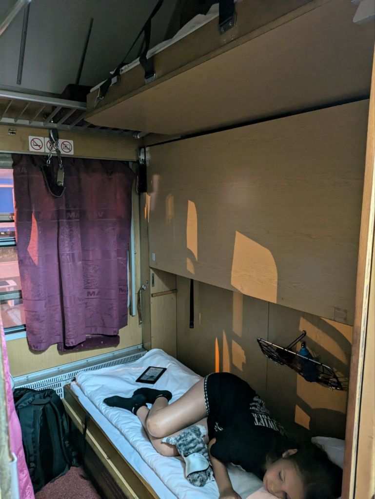 Night train! 2100 from Buda-Deli (Deli means “South”). You could get on board the sleeper car from 2030, so we were well installed before it set off. A bit quirky – the middle bed in my cabin doesn’t work, so I’m up in the Gods. There are various dials for things that don’t seem relevant – a volume control? I haven’t heard any announcements… and hope not to do so – by the dial just goes round and round…hmm. The family are taking this with a very positive attitude, so we’ll see how we get on!