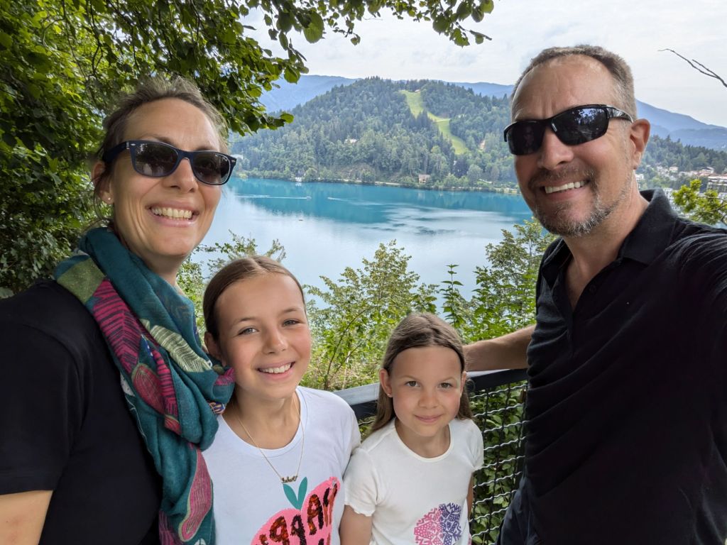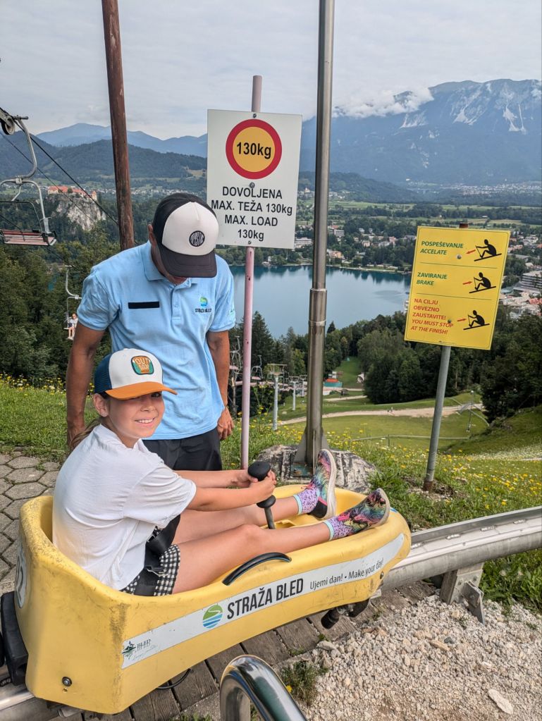 For our last day at Lake Bled, we went first up to the nearby Toboggan Run – you take a chairlift up, then slide down a twisting metal tube on a plastic toboggan. Under 8s needed a grown-up, so I rode with G. It was fun!