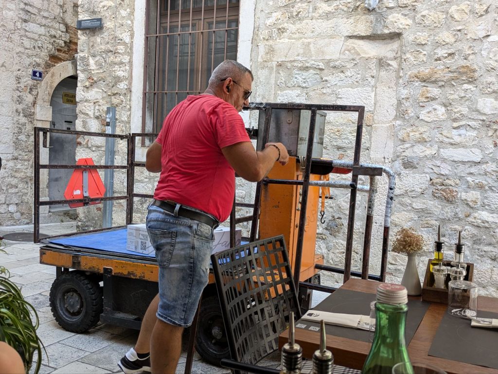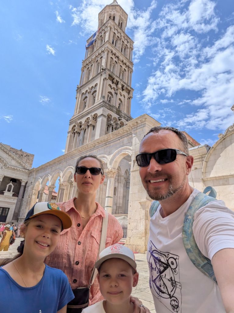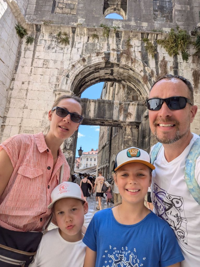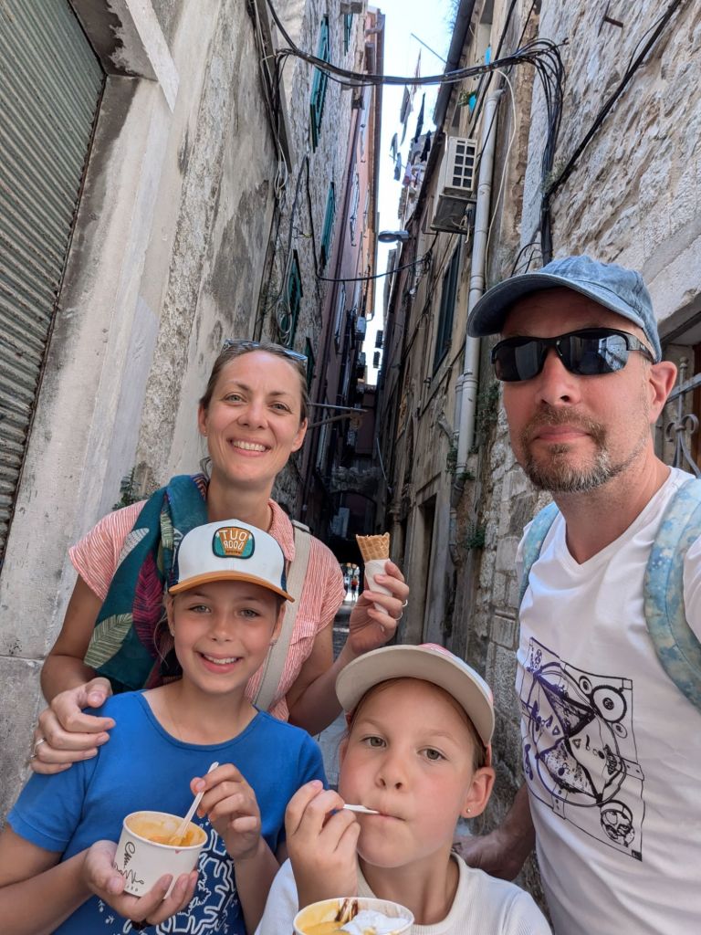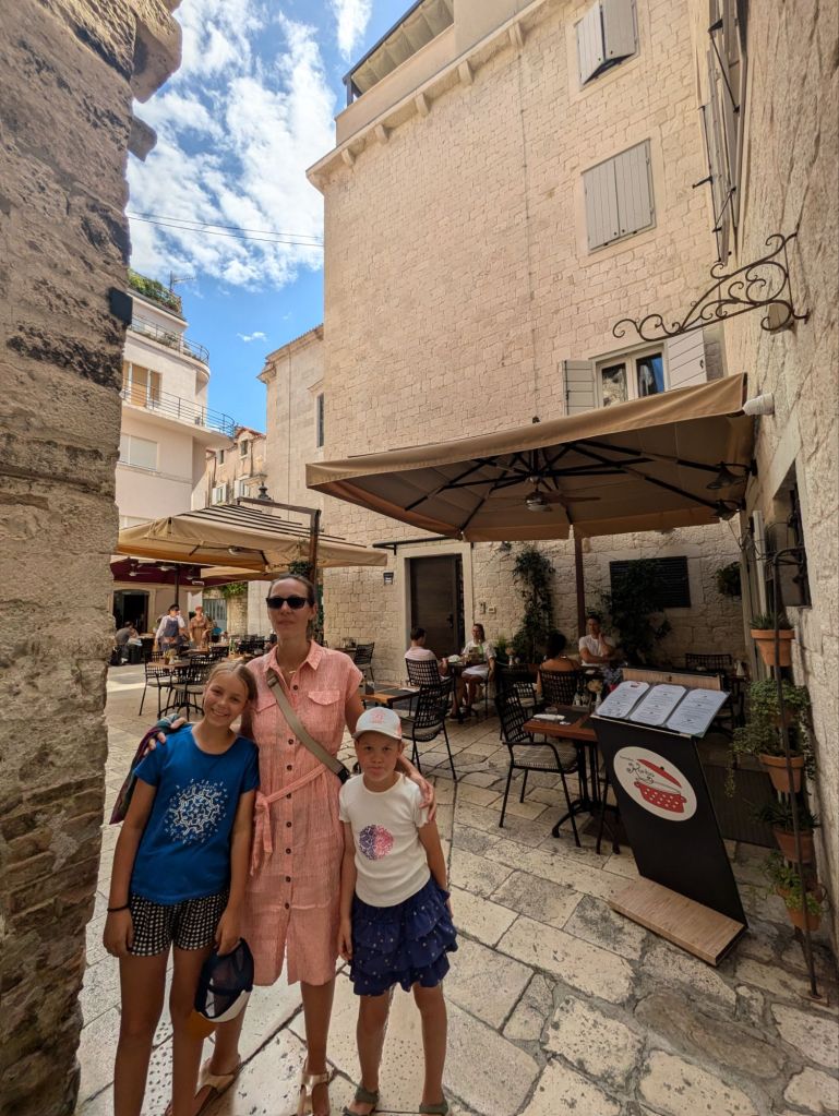 All the places we’ve been have old towns, but Split’s is another level – a big chunk of it is Diocletian’s Palace, actual stonework dating from 300AD that you can stroll around and buy ice creams etc. Our first priority was lunch and fortunately our first choice only had a table partially in the sun, so we went round a corner and found Perfection. Well, the restaurant was called Konoba Korta, but the setting was lovely, the service was pleasant, they had kids menus INCLUDING colouring-in and the food and wine was excellent. If restaurants had a twinning scheme like towns do, I would propose this could be twinned with our excellent local Italian, Sanzio. My seafood risotto was tip top.